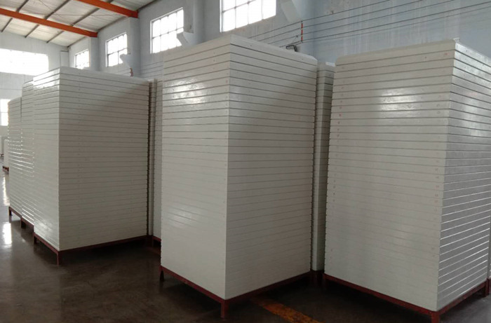將備好的原材料根據(jù)規(guī)則的份額進行配料,然后拌和料漿成樹脂糊;將制成的樹脂糊與玻璃纖維紗通過SMC片材機組浸漬制成SMC片材;通過48h加溫固化后,查驗片材,依照所需標準進行裁剪、稱重、疊放、均勻鋪置于已經(jīng)整理并升溫至120-140℃的模具中進行模壓并依照要求保壓后開模;脫模構(gòu)成成型的SMC單板,對SMC單板的飛邊打磨修整后進行查驗;查驗合格的SMC單板按方位打好安裝孔,進行包裝、入庫;將SMC模壓單板、已按方位打好安裝孔的橡膠密封條、不銹鋼支架(拉筋)組合拼裝成SMC組合式水箱,查驗;查驗合格為制品。